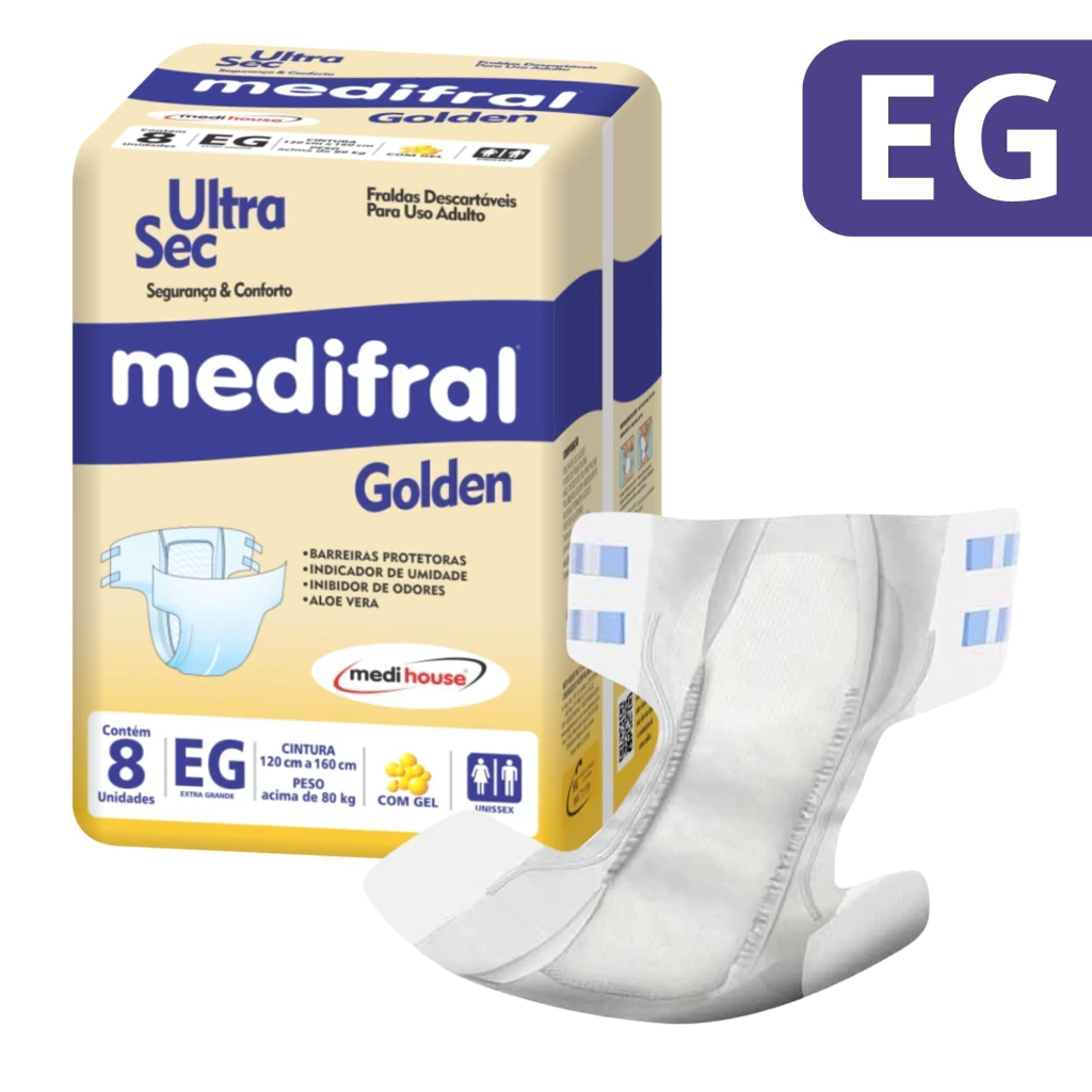 Fralda Descartável Adulto Medifral Golden Medi House Ultra Sec – Pacote com 8 Unidades (P, M, G ou EG)